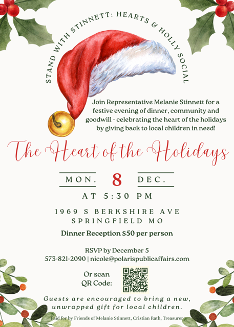 8 | Representative Melanie Stinnett Hearts and Holly Social — 1969 S. Berkshire Ave., Springfield — 5:30 p.m.