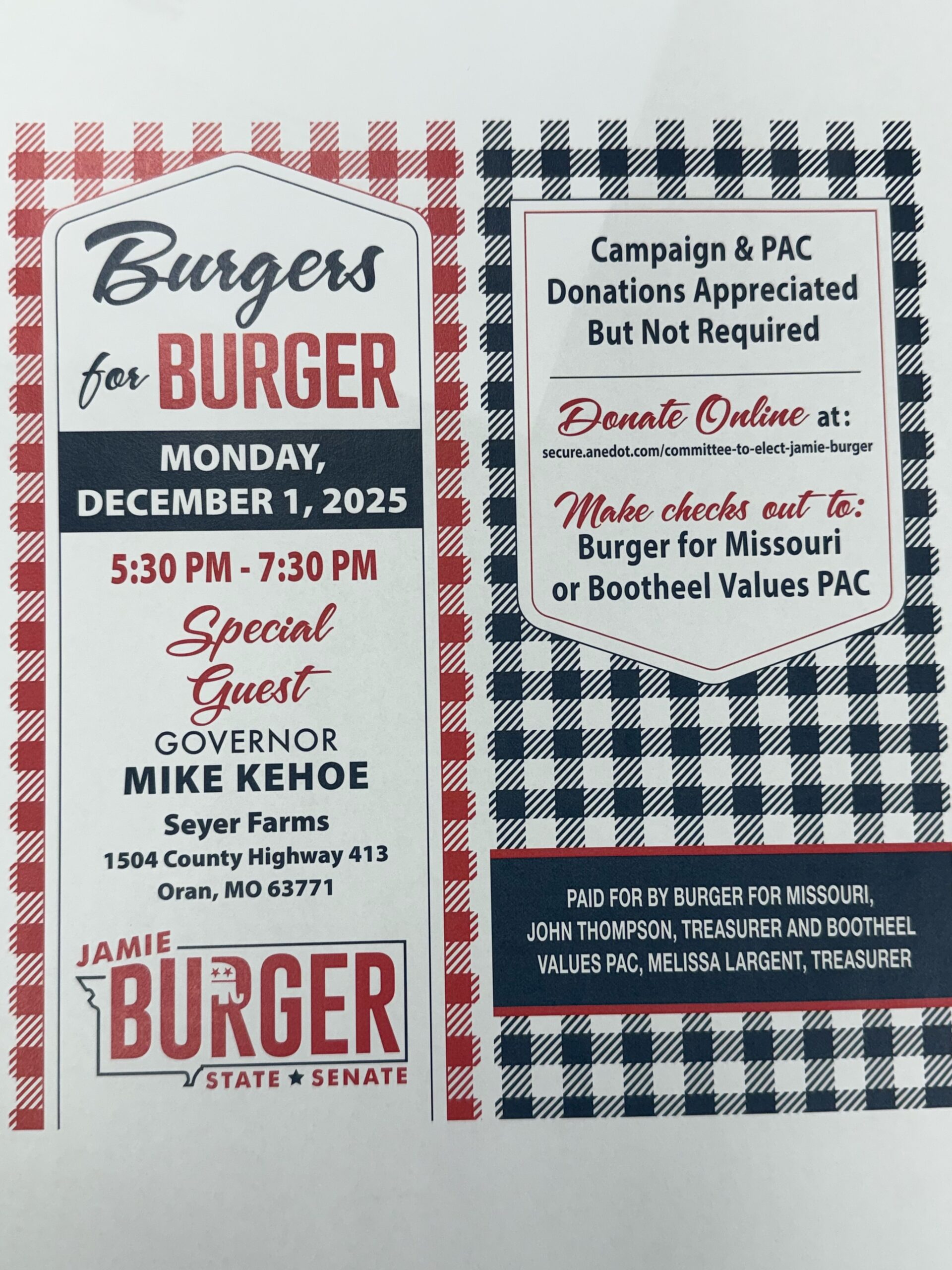 1 | Burgers for Burger, with special guest Governor Mike Kehoe — Seyer Farms; 1504 County Highway 413., Oran — 5:30 – 7:30 p.m.