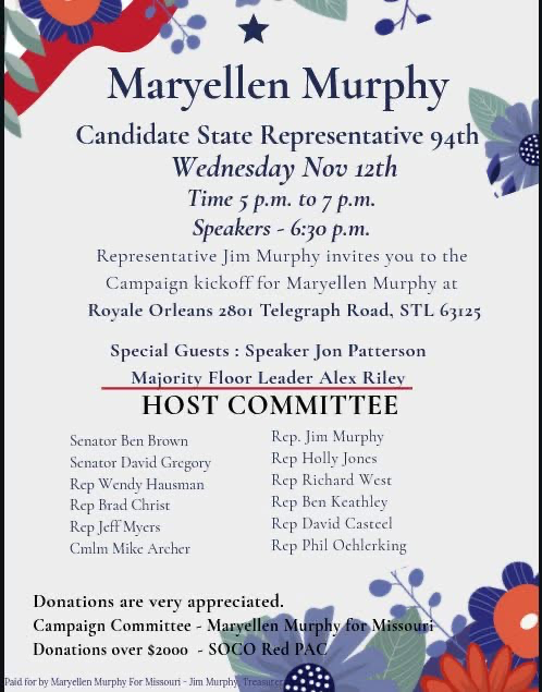 12 | Fundraiser in Support of Candidate for Representative Maryellen Murphy — Royale Orleans; 2801 Telegraph Rd., St. Louis — 5 – 7 p.m.