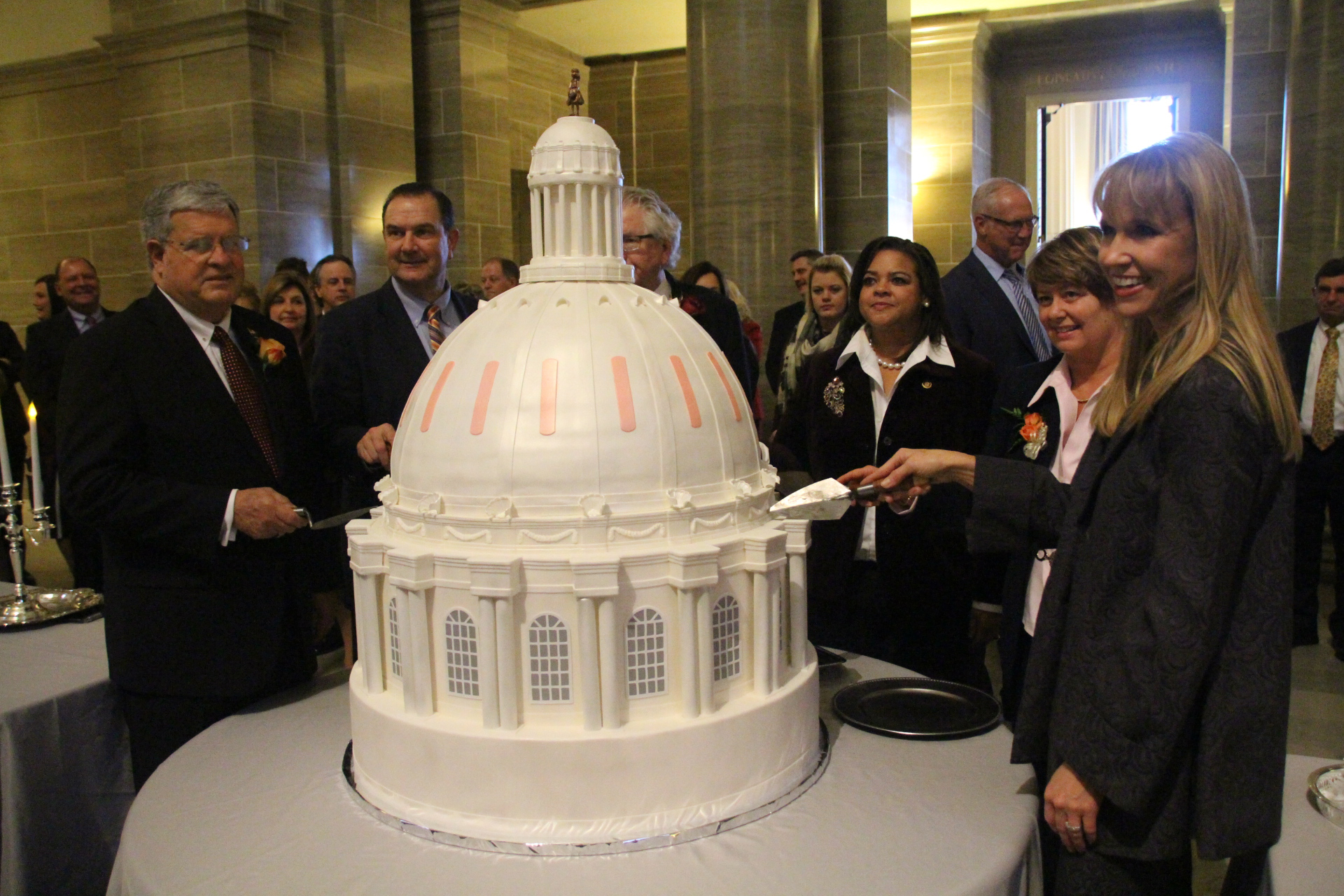 JEFFERSON CITY, Mo. – The Missouri State Capitol Commission celebrated an important milestone in the building’s history Wednesday. After both chambers had adjourned for the day, legislative leaders and members of the commission cut a four-foot tall giant cake in the shape of the Capitol dome the Capitol Rotunda to celebrate the 100th anniversary of the installment of the capstone onto the Capitol.