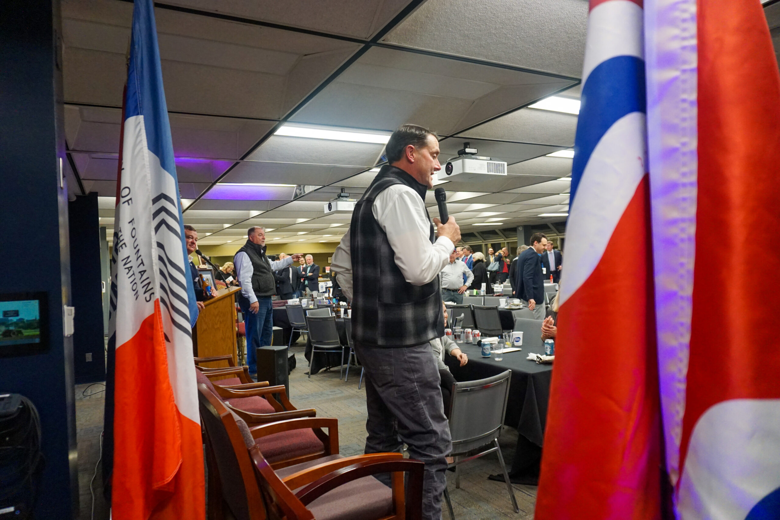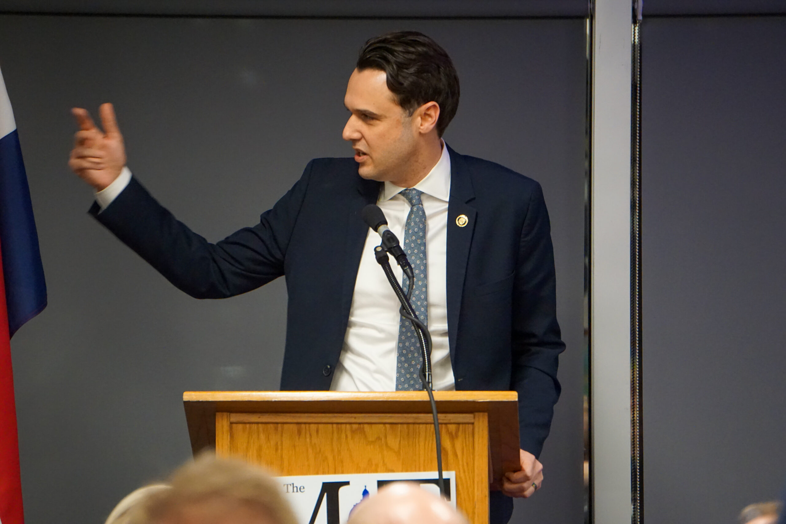 Farm Bureau president Garret Hawkins speaking to the crowd