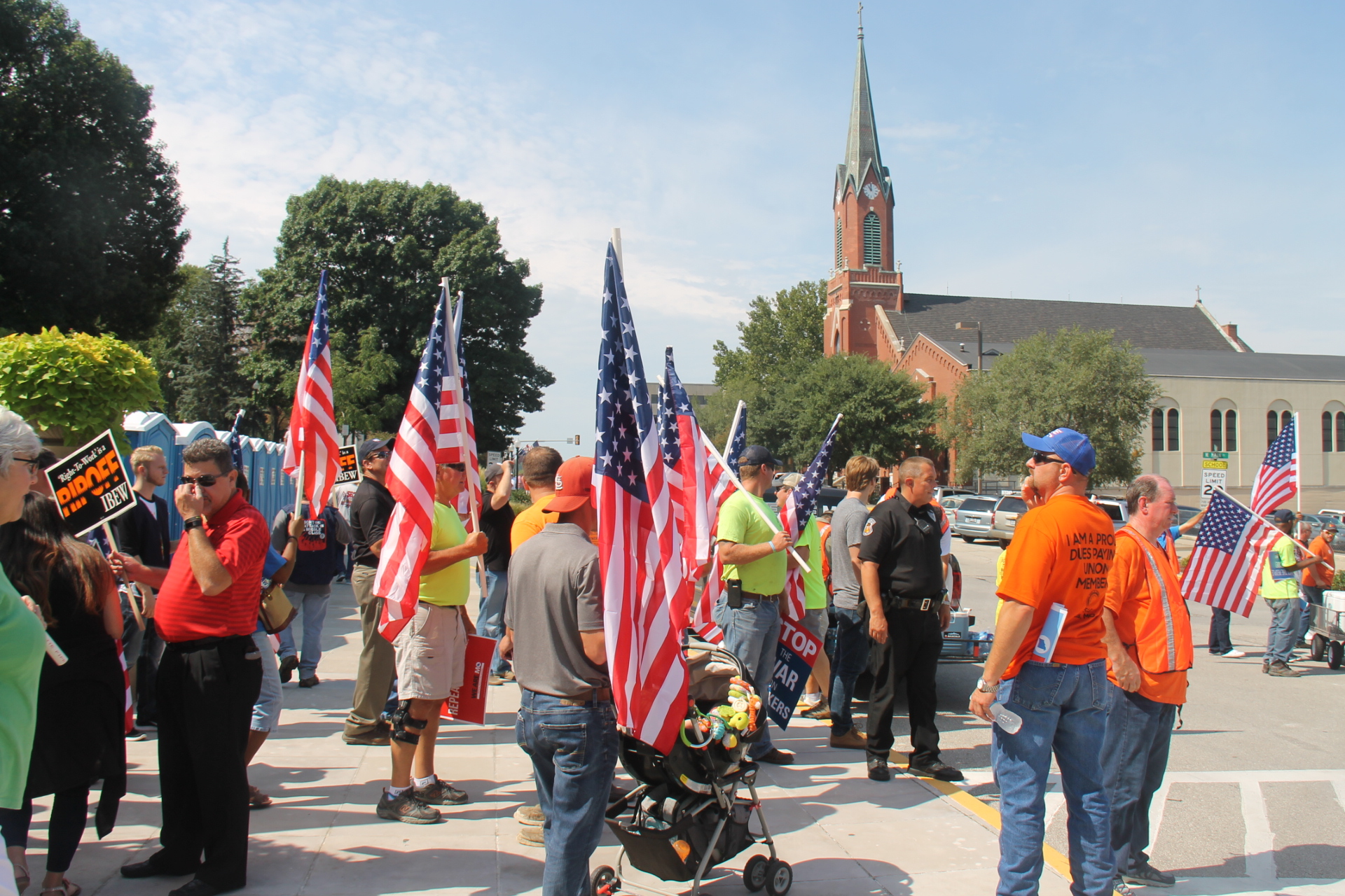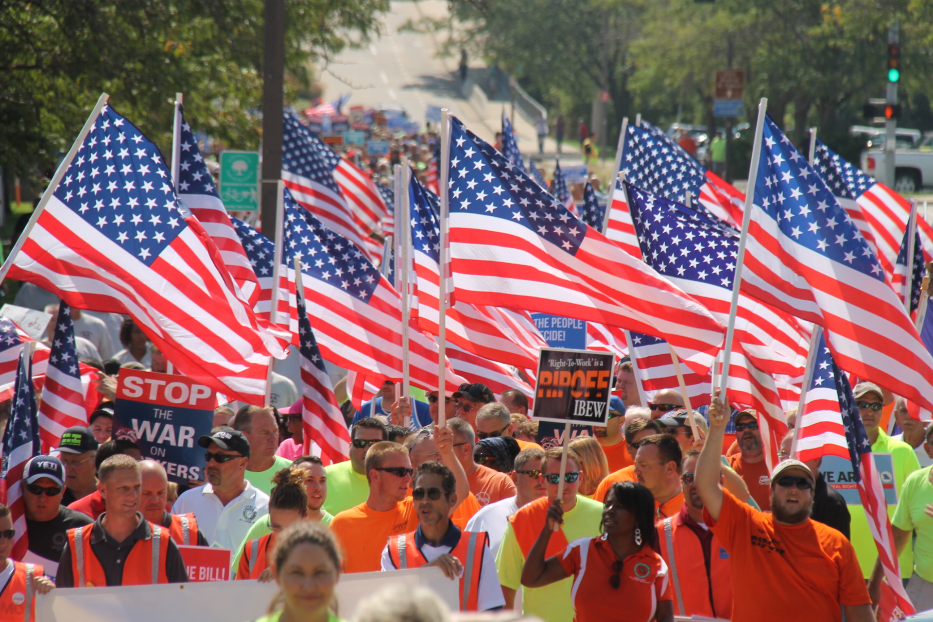 Thousands of anti-RTW protesters crowded the State Capitol on Friday morning, rallying with flags and signs as they submitted the signatures needed to suspend the right-to-work law from taking effect.